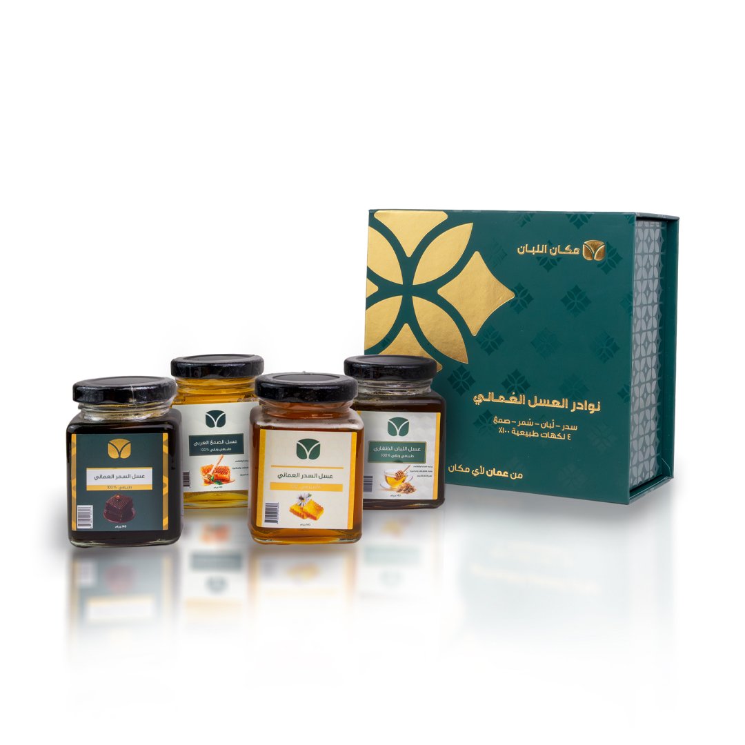 تجمع أربعة من أندر وأجود أنواع العسل العُماني الخام في باقة واحدة جاهزة.